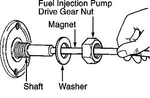 - Remove the nut and washer use a gear puller to pull the fuel injection pump drive gear loose from the shaft.