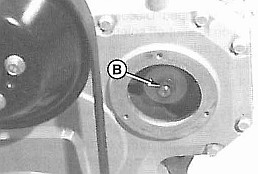 - Remove injection pump drive gear cover. Remove drive gear retaining nut (B) and washer from end of pump shaft. Be careful not to let washer fall inside timing gear cover.