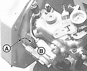 - Check to make sure the timing marks on back side of front plate (A) and injection pump flange (B) are present and properly aligned. This assures that the repaired or replacement pump can be properly timed to engine when installed.